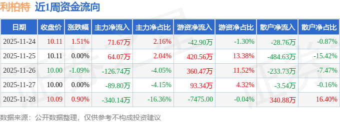 资金流向数据方面,本周利柏特主力资金合计净流出420.94万元,游资资金合计净流入830.73万元,散户资金合计净流出409.79万元。本周资金流向一览见下表: