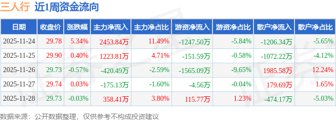 资金流向数据方面,本周三人行主力资金合计净流入3440.44万元,游资资金合计净流出2852.98万元,散户资金合计净流出587.46万元。本周资金流向一览见下表: