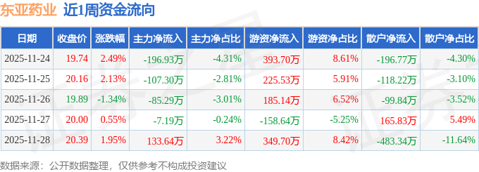 资金流向数据方面,本周东亚药业主力资金合计净流出263.07万元,游资资金合计净流入995.42万元,散户资金合计净流出732.35万元。本周资金流向一览见下表: