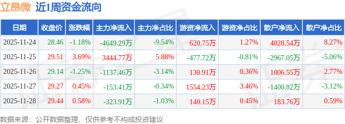 资金流向数据方面,本周立昂微主力资金合计净流出2819.29万元,游资资金合计净流入1968.32万元,散户资金合计净流入850.97万元。本周资金流向一览见下表: