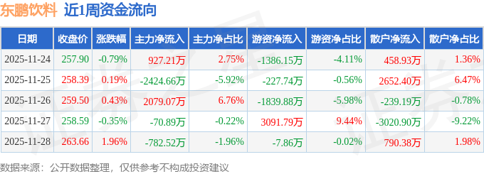 资金流向数据方面,本周东鹏饮料主力资金合计净流出271.78万元,游资资金合计净流出369.83万元,散户资金合计净流入641.62万元。本周资金流向一览见下表: