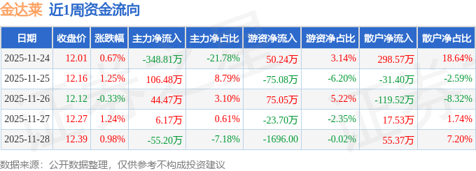 资金流向数据方面,本周金达莱主力资金合计净流出246.89万元,游资资金合计净流入26.34万元,散户资金合计净流入220.55万元。本周资金流向一览见下表: