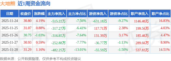 资金流向数据方面,本周大地熊主力资金合计净流出1884.47万元,游资资金合计净流出474.44万元,散户资金合计净流入2358.91万元。本周资金流向一览见下表: