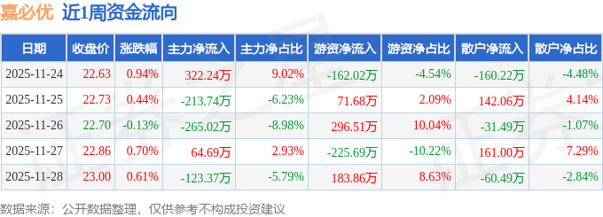资金流向数据方面,本周嘉必优主力资金合计净流出215.2万元,游资资金合计净流入164.35万元,散户资金合计净流入50.85万元。本周资金流向一览见下表: