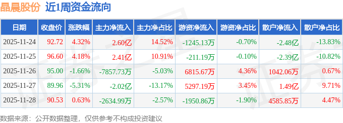 资金流向数据方面,本周晶晨股份主力资金合计净流入1.94亿元,游资资金合计净流入8705.68万元,散户资金合计净流出2.81亿元。本周资金流向一览见下表: