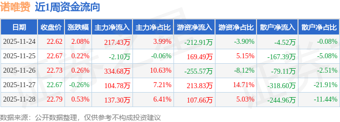 资金流向数据方面,本周诺唯赞主力资金合计净流入792.09万元,游资资金合计净流入22.49万元,散户资金合计净流出814.58万元。本周资金流向一览见下表: