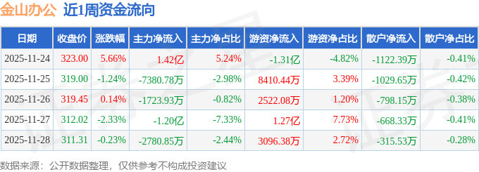 资金流向数据方面,本周金山办公主力资金合计净流出9732.0万元,游资资金合计净流入1.37亿元,散户资金合计净流出3934.05万元。本周资金流向一览见下表: