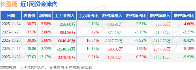 资金流向数据方面,本周长盈通主力资金合计净流入5506.92万元,游资资金合计净流出2935.36万元,散户资金合计净流出2571.56万元。本周资金流向一览见下表: