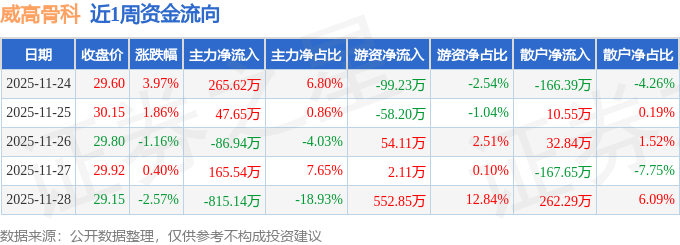 资金流向数据方面,本周威高骨科主力资金合计净流出423.28万元,游资资金合计净流入451.64万元,散户资金合计净流出28.36万元。本周资金流向一览见下表: