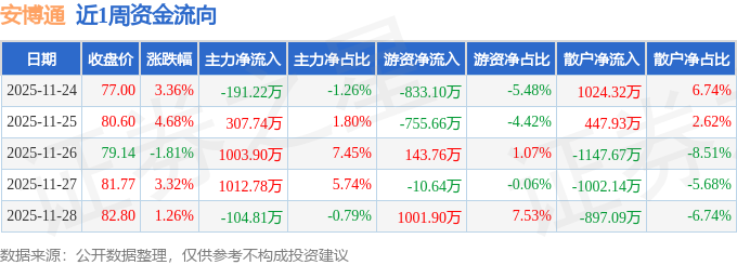 资金流向数据方面,本周安博通主力资金合计净流入2028.38万元,游资资金合计净流出453.74万元,散户资金合计净流出1574.64万元。本周资金流向一览见下表: