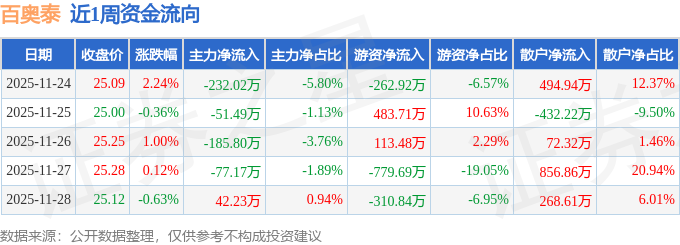 资金流向数据方面,本周百奥泰主力资金合计净流出504.24万元,游资资金合计净流出756.26万元,散户资金合计净流入1260.5万元。本周资金流向一览见下表: