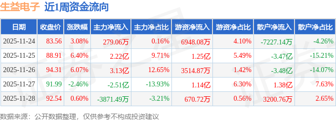 资金流向数据方面,本周生益电子主力资金合计净流入2.48亿元,游资资金合计净流入3.5亿元,散户资金合计净流出5.98亿元。本周资金流向一览见下表:
