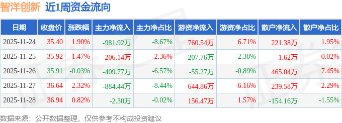 资金流向数据方面,本周智洋创新主力资金合计净流出2072.29万元,游资资金合计净流入1298.83万元,散户资金合计净流入773.46万元。本周资金流向一览见下表: