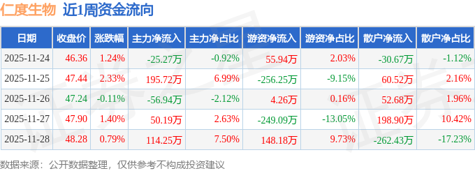 资金流向数据方面,本周仁度生物主力资金合计净流入277.95万元,游资资金合计净流出296.96万元,散户资金合计净流入19.01万元。本周资金流向一览见下表: