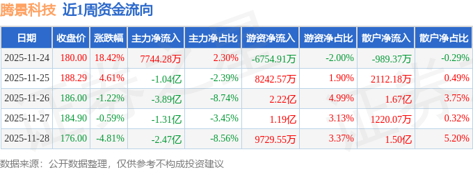资金流向数据方面,本周腾景科技主力资金合计净流出7.93亿元,游资资金合计净流入4.53亿元,散户资金合计净流入3.4亿元。本周资金流向一览见下表: