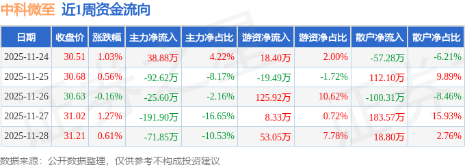 资金流向数据方面,本周中科微至主力资金合计净流出343.09万元,游资资金合计净流入186.21万元,散户资金合计净流入156.88万元。本周资金流向一览见下表: