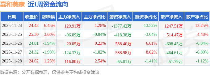 资金流向数据方面,本周嘉和美康主力资金合计净流入46.3万元,游资资金合计净流出683.44万元,散户资金合计净流入637.13万元。本周资金流向一览见下表: