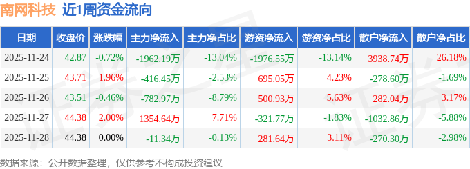 资金流向数据方面,本周南网科技主力资金合计净流出1818.31万元,游资资金合计净流出820.71万元,散户资金合计净流入2639.02万元。本周资金流向一览见下表: