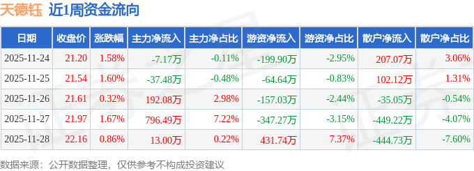 资金流向数据方面,本周天德钰主力资金合计净流入956.92万元,游资资金合计净流出337.12万元,散户资金合计净流出619.81万元。本周资金流向一览见下表: