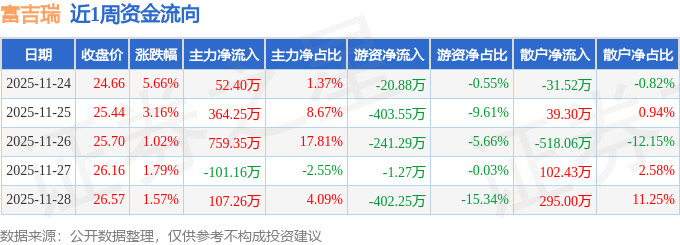 资金流向数据方面,本周富吉瑞主力资金合计净流入1182.09万元,游资资金合计净流出1069.24万元,散户资金合计净流出112.85万元。本周资金流向一览见下表: