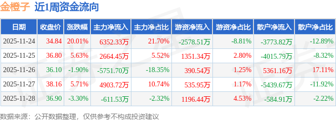 资金流向数据方面,本周金橙子主力资金合计净流入7557.26万元,游资资金合计净流入895.77万元,散户资金合计净流出8453.03万元。本周资金流向一览见下表: