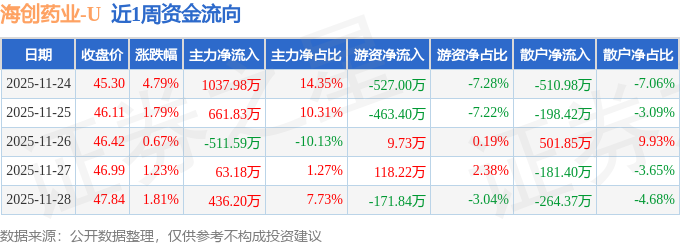 资金流向数据方面,本周海创药业主力资金合计净流入1687.6万元,游资资金合计净流出1034.29万元,散户资金合计净流出653.31万元。本周资金流向一览见下表: