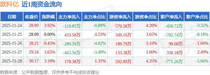 资金流向数据方面,本周欧科亿主力资金合计净流出260.85万元,游资资金合计净流入1835.8万元,散户资金合计净流出1574.95万元。本周资金流向一览见下表: