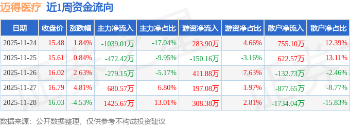 资金流向数据方面,本周迈得医疗主力资金合计净流入315.66万元,游资资金合计净流入1051.08万元,散户资金合计净流出1366.74万元。本周资金流向一览见下表: