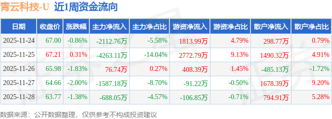 资金流向数据方面,本周青云科技主力资金合计净流出8574.36万元,游资资金合计净流入4797.09万元,散户资金合计净流入3777.27万元。本周资金流向一览见下表: