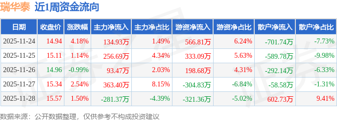 资金流向数据方面,本周瑞华泰主力资金合计净流入567.12万元,游资资金合计净流入472.39万元,散户资金合计净流出1039.51万元。本周资金流向一览见下表:
