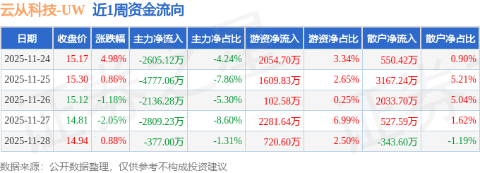 资金流向数据方面,本周云从科技主力资金合计净流出1.27亿元,游资资金合计净流入6769.34万元,散户资金合计净流入5935.35万元。本周资金流向一览见下表: