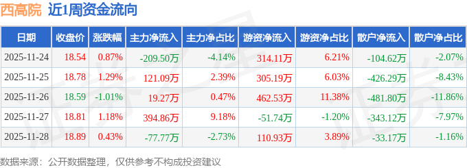 资金流向数据方面,本周西高院主力资金合计净流入247.96万元,游资资金合计净流入1141.03万元,散户资金合计净流出1388.99万元。本周资金流向一览见下表: