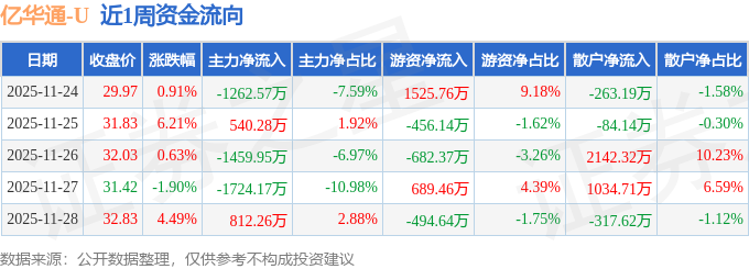 资金流向数据方面,本周亿华通主力资金合计净流出3094.15万元,游资资金合计净流入582.07万元,散户资金合计净流入2512.08万元。本周资金流向一览见下表: