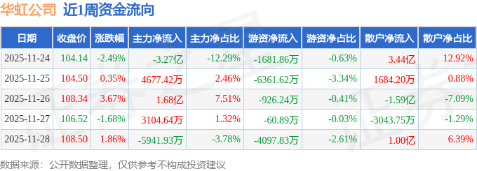 资金流向数据方面,本周华虹公司主力资金合计净流出1.4亿元,游资资金合计净流出1.31亿元,散户资金合计净流入2.72亿元。本周资金流向一览见下表: