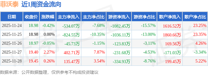 资金流向数据方面,本周菲沃泰主力资金合计净流出866.16万元,游资资金合计净流出2809.0万元,散户资金合计净流入3675.16万元。本周资金流向一览见下表: