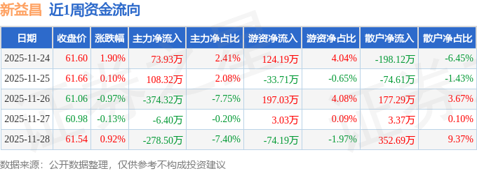 资金流向数据方面,本周新益昌主力资金合计净流出476.97万元,游资资金合计净流入216.35万元,散户资金合计净流入260.62万元。本周资金流向一览见下表: