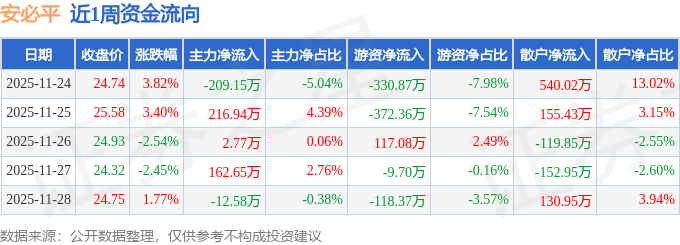 资金流向数据方面,本周安必平主力资金合计净流入160.63万元,游资资金合计净流出714.23万元,散户资金合计净流入553.6万元。本周资金流向一览见下表: