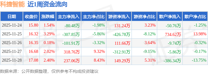 资金流向数据方面,本周科捷智能主力资金合计净流入65.58万元,游资资金合计净流出347.5万元,散户资金合计净流入281.92万元。本周资金流向一览见下表: