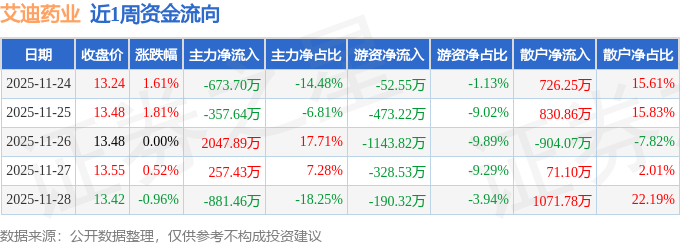 资金流向数据方面,本周艾迪药业主力资金合计净流入392.52万元,游资资金合计净流出2188.45万元,散户资金合计净流入1795.92万元。本周资金流向一览见下表:
