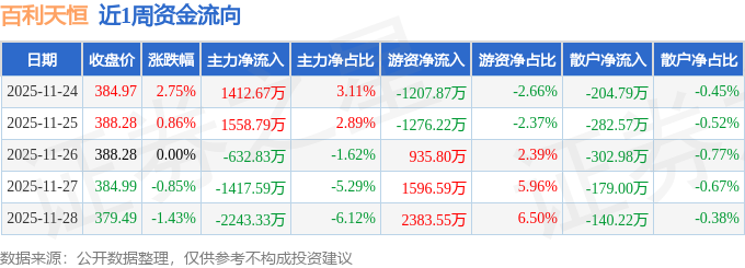 资金流向数据方面,本周百利天恒主力资金合计净流出1322.29万元,游资资金合计净流入2431.86万元,散户资金合计净流出1109.57万元。本周资金流向一览见下表: