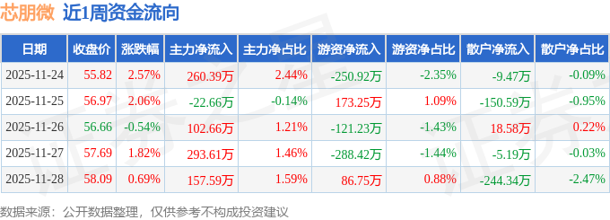资金流向数据方面,本周芯朋微主力资金合计净流入791.59万元,游资资金合计净流出400.57万元,散户资金合计净流出391.02万元。本周资金流向一览见下表: