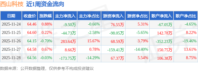 资金流向数据方面,本周西山科技主力资金合计净流入64.33万元,游资资金合计净流出44.96万元,散户资金合计净流出19.36万元。本周资金流向一览见下表: