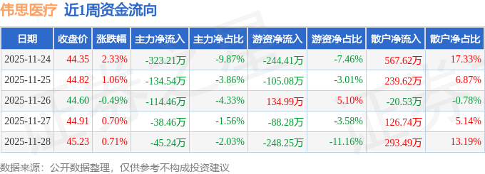 资金流向数据方面,本周伟思医疗主力资金合计净流出655.9万元,游资资金合计净流出551.03万元,散户资金合计净流入1206.94万元。本周资金流向一览见下表: