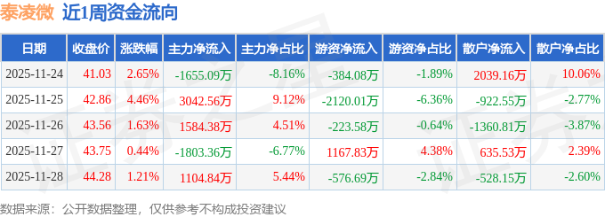 资金流向数据方面,本周泰凌微主力资金合计净流入2273.34万元,游资资金合计净流出2136.53万元,散户资金合计净流出136.81万元。本周资金流向一览见下表: