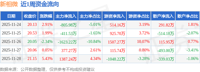 资金流向数据方面,本周新相微主力资金合计净流出1076.22万元,游资资金合计净流入2014.65万元,散户资金合计净流出938.44万元。本周资金流向一览见下表: