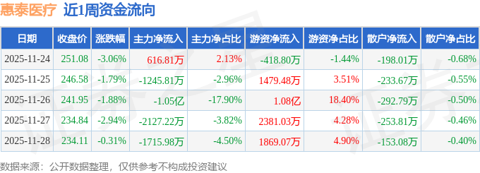 资金流向数据方面,本周惠泰医疗主力资金合计净流出1.49亿元,游资资金合计净流入1.61亿元,散户资金合计净流出1131.36万元。本周资金流向一览见下表: