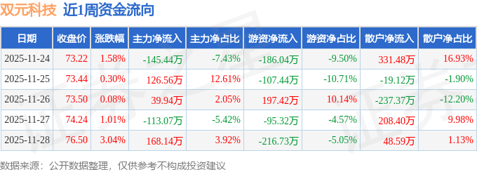 资金流向数据方面,本周双元科技主力资金合计净流入76.13万元,游资资金合计净流出408.12万元,散户资金合计净流入331.98万元。本周资金流向一览见下表: