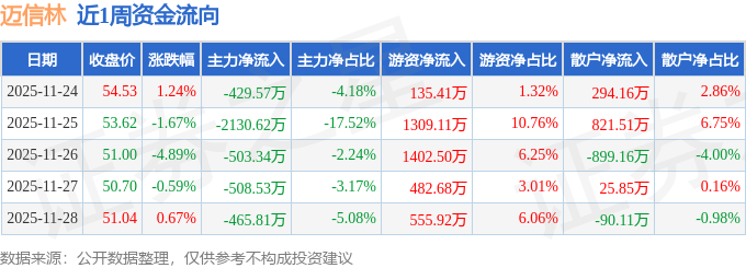资金流向数据方面,本周迈信林主力资金合计净流出4037.87万元,游资资金合计净流入3885.62万元,散户资金合计净流入152.25万元。本周资金流向一览见下表: