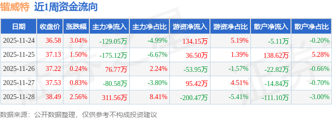 资金流向数据方面,本周锴威特主力资金合计净流入3.6万元,游资资金合计净流入11.66万元,散户资金合计净流出15.25万元。本周资金流向一览见下表:
