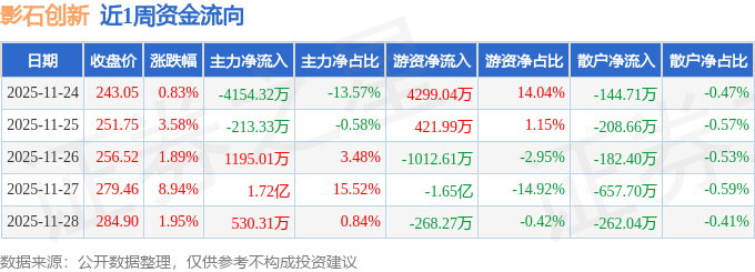 资金流向数据方面,本周影石创新主力资金合计净流入1.45亿元,游资资金合计净流出1.31亿元,散户资金合计净流出1455.51万元。本周资金流向一览见下表: